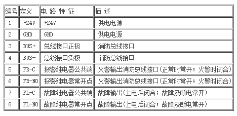 四.Flax53點型紅外火焰探測器接線方式;所有信號線和電源線宜采用截面積大于1.0mm的導線,并嚴格按規范要求進行布線,其中探測器外殼應良好接地。探測器接線定義見下表: