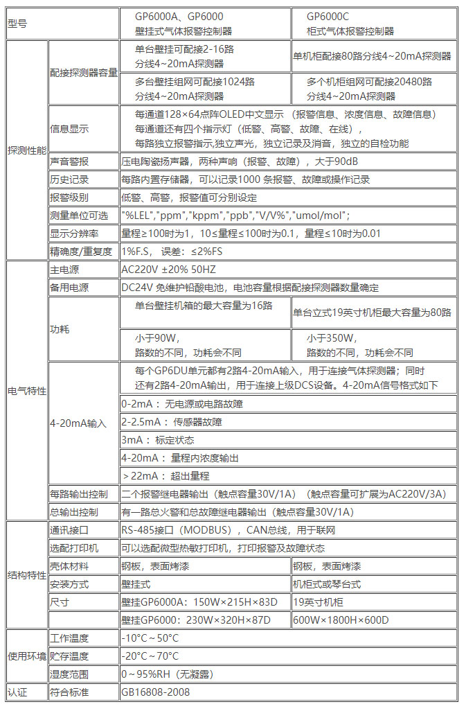 四.GP6000氣體報警控制器技術參數(shù)