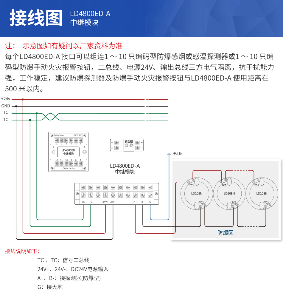 3、建議防爆探測器及防爆手動火災報警按鈕與LD4800ED-A使用距離在500米以內。