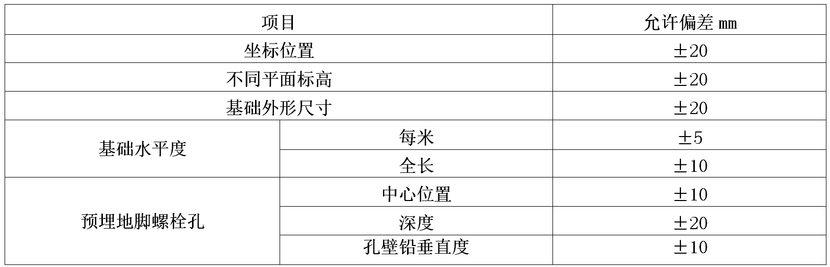 1、水泵安裝前應對基礎外觀進行檢査,基礎不得有裂紋、蜂窩、空洞、露筋等缺陷,對基礎位 置和尺寸;S行復測,其允許誤差'如表4. 2.1所示: