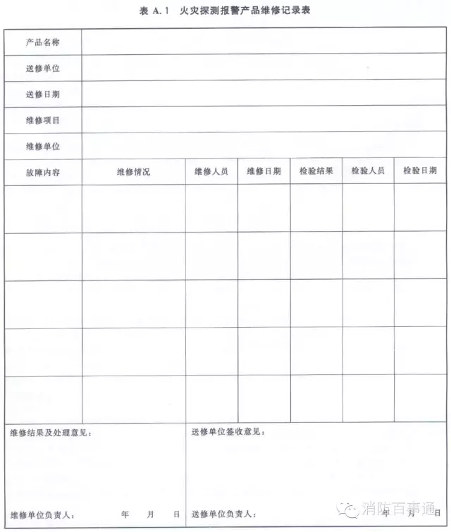 3.1.6承擔(dān)維修的企業(yè)應(yīng)做好維修記錄,與產(chǎn)品使用或管理單位各執(zhí)一份,并保存至該產(chǎn)品報廢。火災(zāi)探測報警產(chǎn)品維修記錄表的格式參見附錄A。