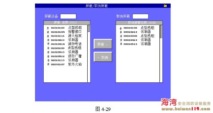 當(dāng)外部設(shè)備(探測(cè)器、模塊或火災(zāi)顯示盤(pán))發(fā)生故障時(shí),可將它屏蔽掉,待修理或更換后,再利用取消屏蔽功能將設(shè)備恢復(fù)。