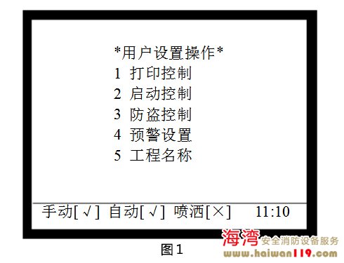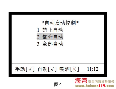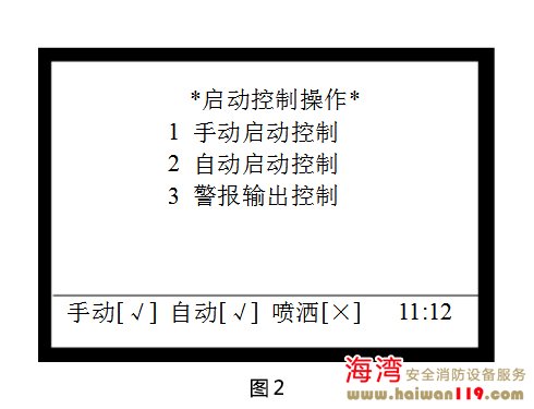 啟動控制設(shè)置 在圖1所示界面下,按2進入“啟動控制”界面,調(diào)出啟動控制操作菜單,如圖2所示,包含手動啟動控制、自動啟動控制、警報輸出控制的設(shè)置,可通過按下其對應(yīng)的數(shù)字鍵進行相關(guān)的設(shè)置